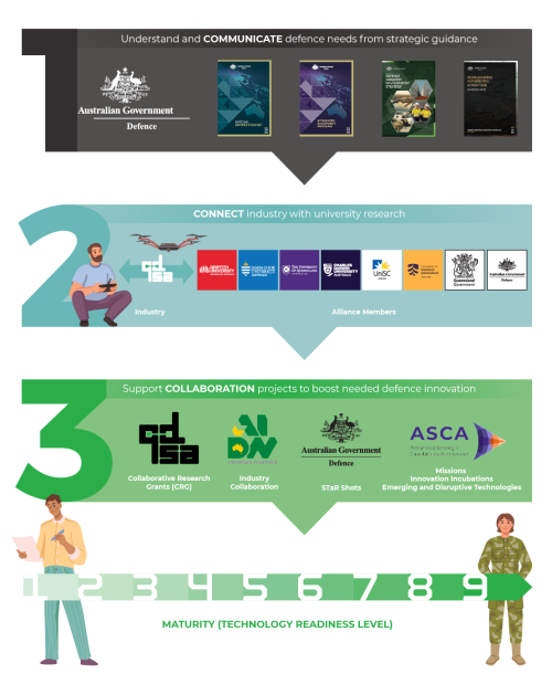 We provide a platform – and community – that showcases, funds, nurtures, and propels communication and collaborations between our Queensland and Northern Territory members and stakeholders, with the goal to deliver sovereign capability to solve Defence needs.